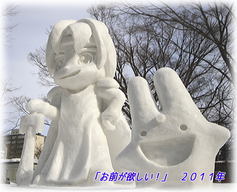 | 時は過ぎて2011年。雪まつりに「雪ミク」が登場するなど、我々が先鞭をつけた(?!)「二次元キャラクターの雪像」がすっかり市民権を得る時代に。ならば「”雪ミク”に見劣りしない雪像を作ろう!」と一念発起してシェゾの雪像に挑戦。「お前が欲しい!」と銘打った雪像は、遠くからわざわざ飛行機で見に来てくださる方が続出するほどの大ヒットになりましたが、期せずしてこれが最後の「ぷよキャラ雪像」となりました。 作っていたのは、北海道に住むファン有志の集まり「チームびっくり魔導人間」。企画やデザイン、実際の制作まで、ぜんぶファン有志だけで勝手にやっていました。ちょっとヘンなチーム名の由来は、当時の作り手達が好きだった某ローカル番組の迷企画から。仮のつもりで適当につけた名前が、そのまま定着してしまいました。 |