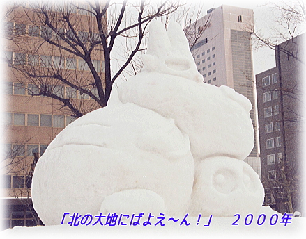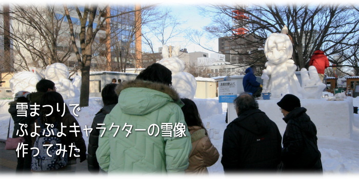 | 世界中から200万人の観光客が訪れるという「さっぽろ雪まつり」。札幌市の中心部にある「大通会場」のあちこちで目にする「市民雪像」と呼ばれる2メートルほどの小雪像たちは市民や学生によって作られたもので、はるか昔に市民や学生が小さな雪像を作って始まったという「さっぽろ雪まつり」の原点といえます。 市民雪像のデザインは定められたルールのもとで自由に決められますが、その時の流行や出来事などが反映される事が多く、市民雪像でモデルにされることが「人気のバロメーター」と言われる事があります。「ぷよぷよ」も家庭用ゲーム機に登場してヒットした1994年頃から「カーバンクル」や「ぷよ」を模した市民雪像がちらほら見られるようになったようです。 |