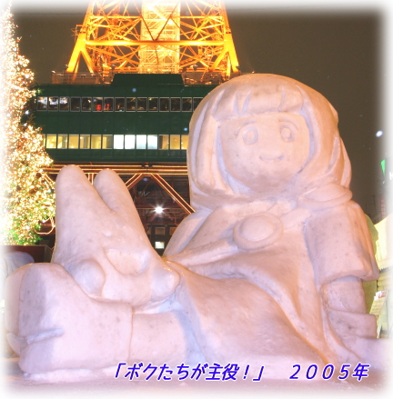 | 「ぷよキャラ雪像」づくりは、その後作り手有志による新しいチームに引き継がれ、雪像の出来は年を追うごとに良くなって行きました。アルル、セリリ、ウィッチと、次々と女の子のキャラクターを雪像にして、ついにはネット上で「萌えキャラ雪像」と呼ばれるように(そんなつもりはなかったのに!)。 ネット上に巻き起こった「次はどの娘を雪像に?」という期待に、荒々しいすけとうだらの雪像を作って応えたことも(笑)。2009年には人手不足で雪像づくりが危ぶまれましたが、多くのみなさんの応援に支えられて続けることができました。 |